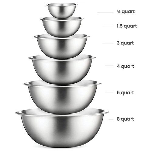 With A range of 6 Sizes—¾, 1.5, 3, 4, 5, and 8 quart—metal mixing bowls add versatility and functionality to your kitchen. For all-purpose kitchen workhorses from prepping, mixing, stirring, to kneading dough like a pro